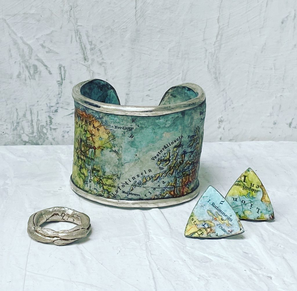 gegossener Silberring, Armreif Weltenbummeler, Ohrstecker Land und Meer, PapierJolie, Silber